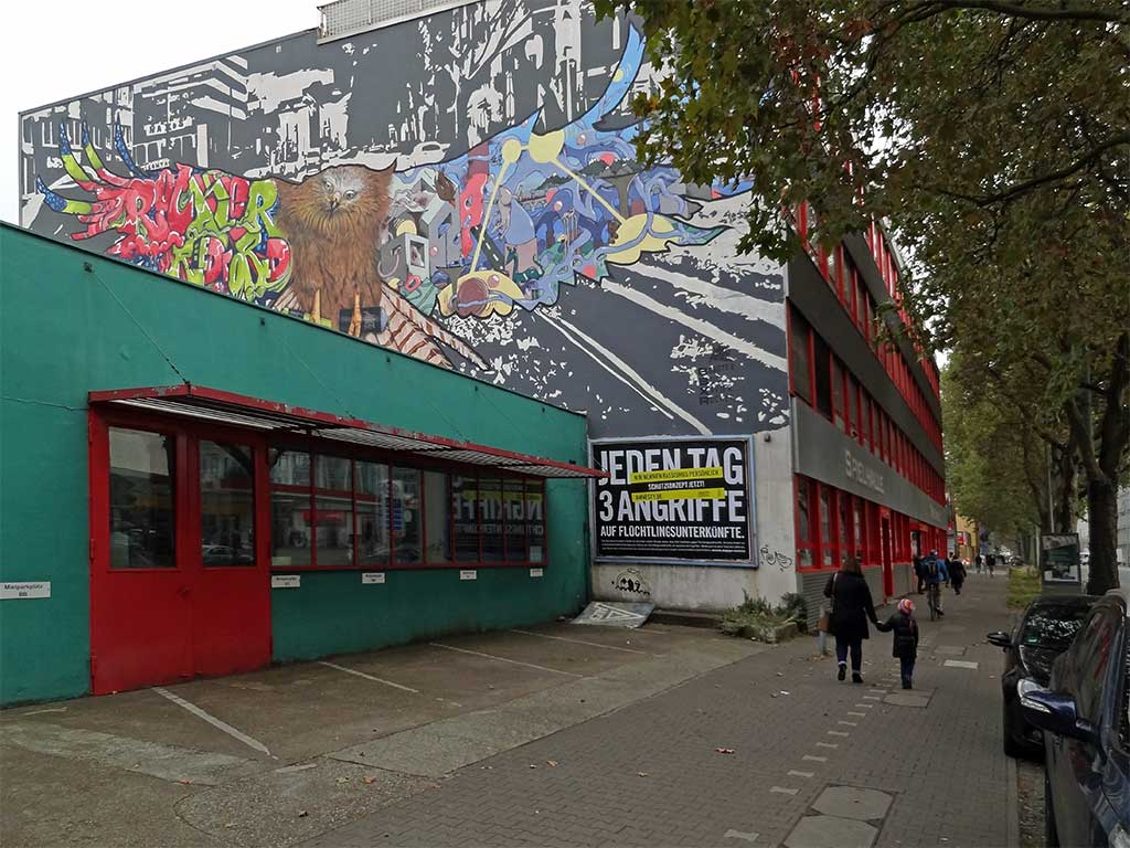 A mural by Naxos Atelier was created along Hanauer Landstraße in October 2016. A colorful eagle can be seen against a monochrome background. It spreads its wings and holds a marker and spray can on its claws. The painting is the first work in the "Frankfurt Walls" project. It was realized by Balázs Vesszösi alias Boboter, Bud, Lebsch Fryday, Rocker Redford and Stefania.