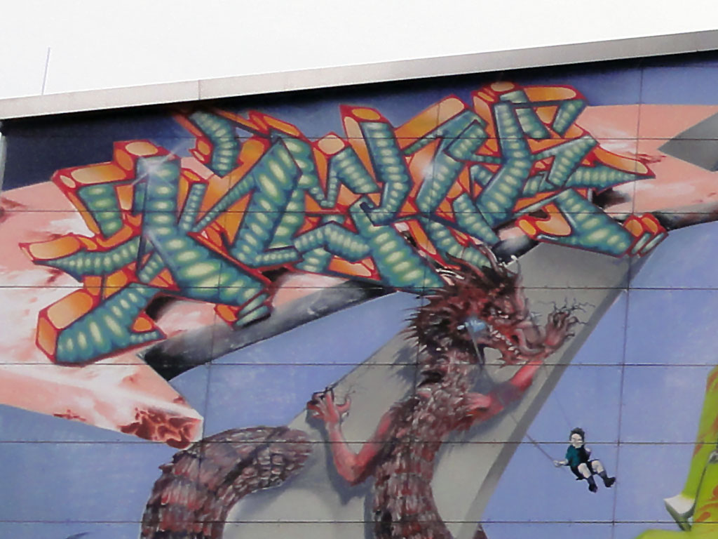 Back in 1997, a building in the Bockenheim district was redesigned with colorful graffiti. This is the Sophienschule, one of the few remaining secondary schools in Frankfurt am Main. The entire façade of the building in Juliusstraße was painted. The mural is a joint work by the graffiti artists Bomber (*1969 in Hofheim/Ts.), Codeak (*1969 in London), Daim (*1971 in Lüneburg), Klark Kent (*1973 in Frankfurt am Main) and Loomit (*1968 in Celle).